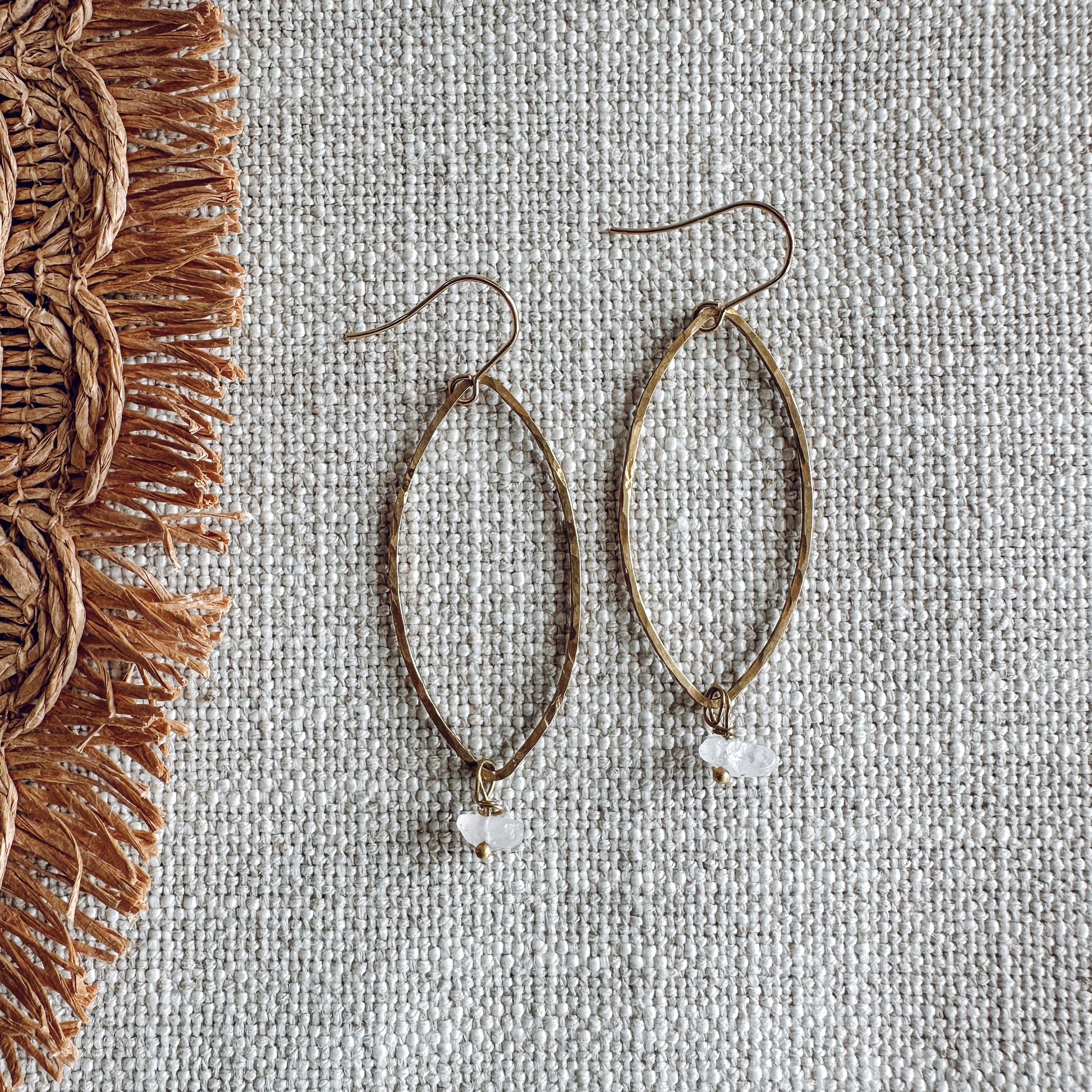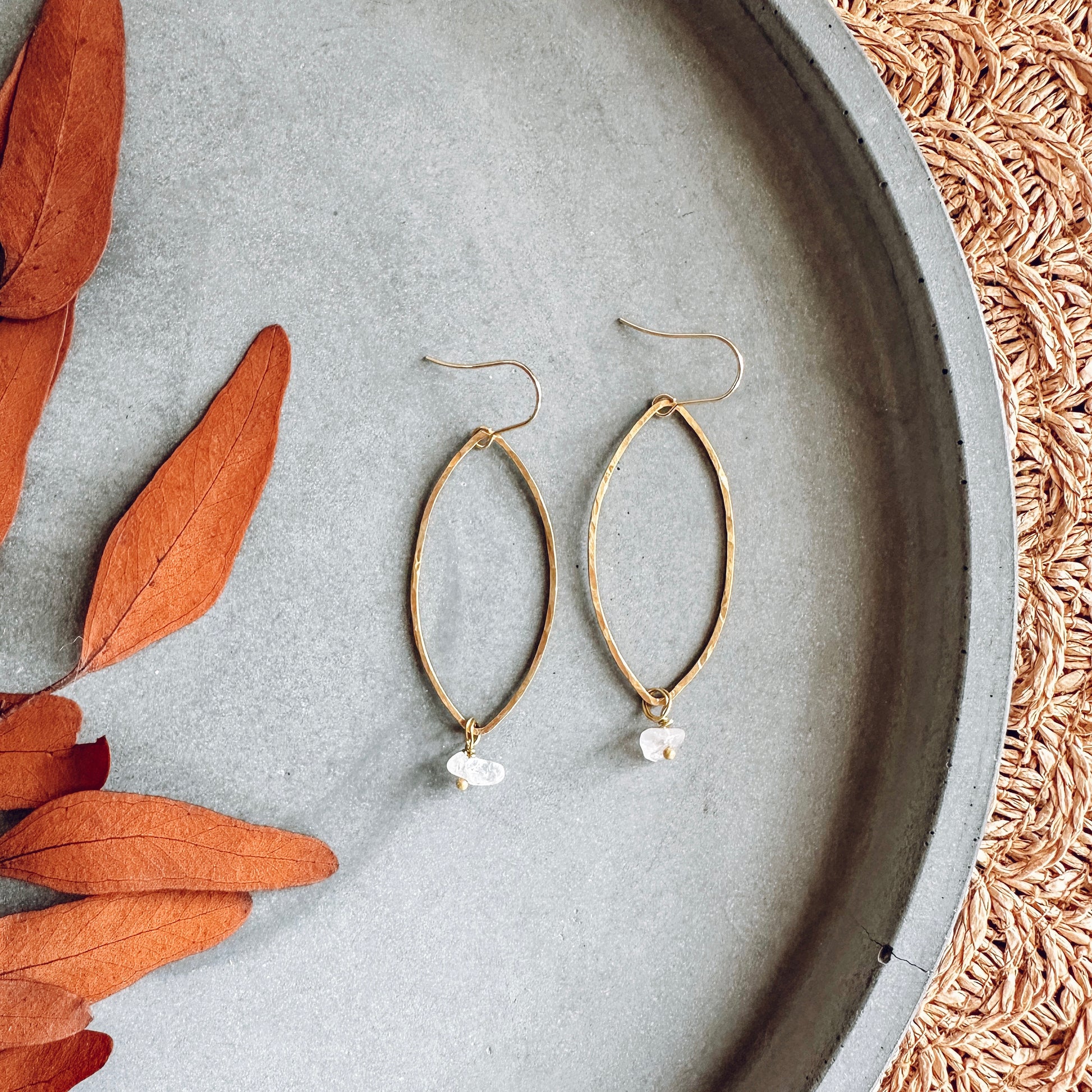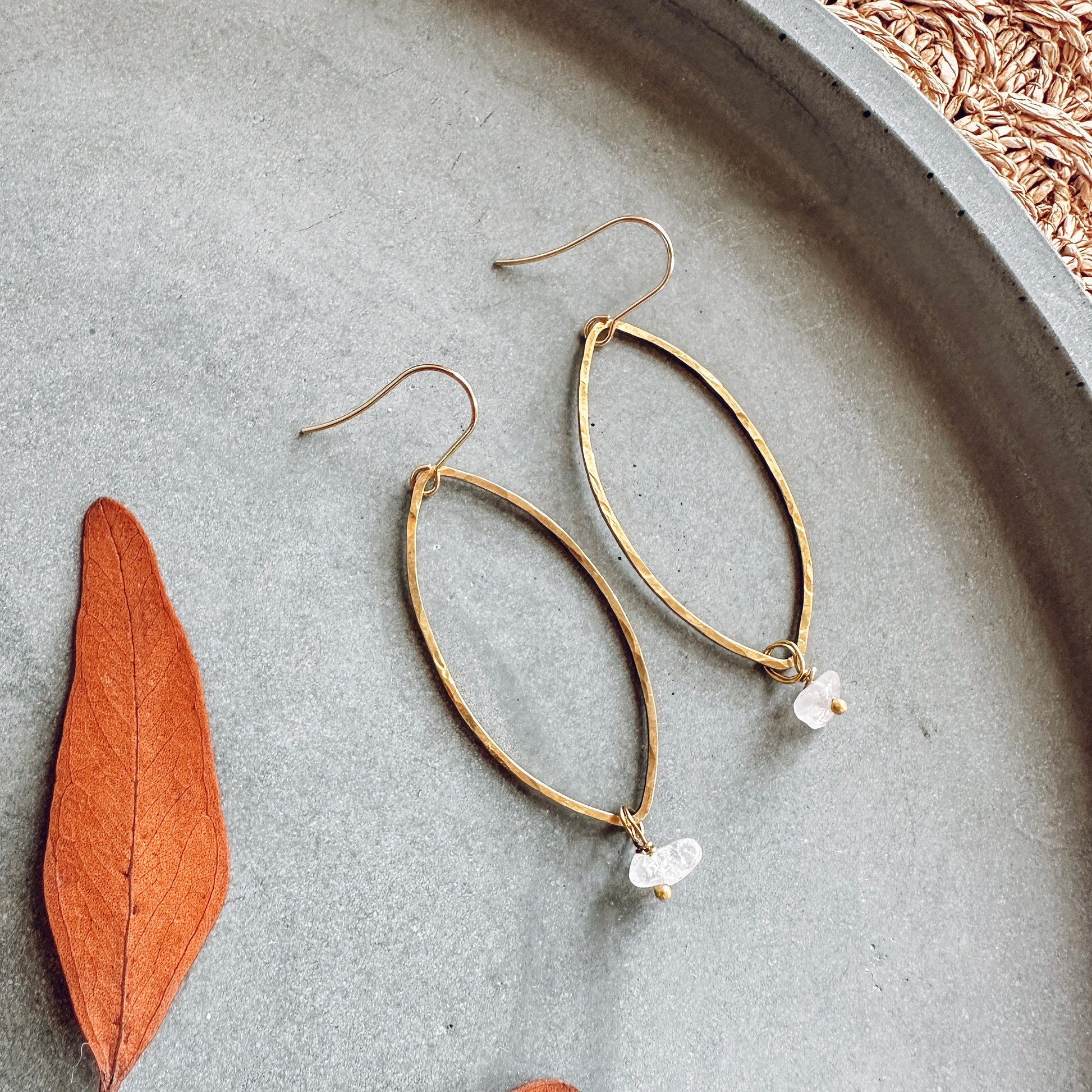 Warm brass petals with a soft hammered texture, finished with a gentle drop of Rose Quartz. A lightweight, effortless pair with a hint of romance.